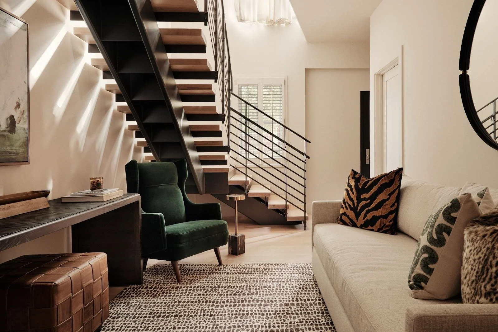Upstairs, this loft opens into a light-filled living and kitchen space made for entertaining. We chose a rich chocolate velvet sectional and layered it with fur and leather textures for warmth and sophistication.