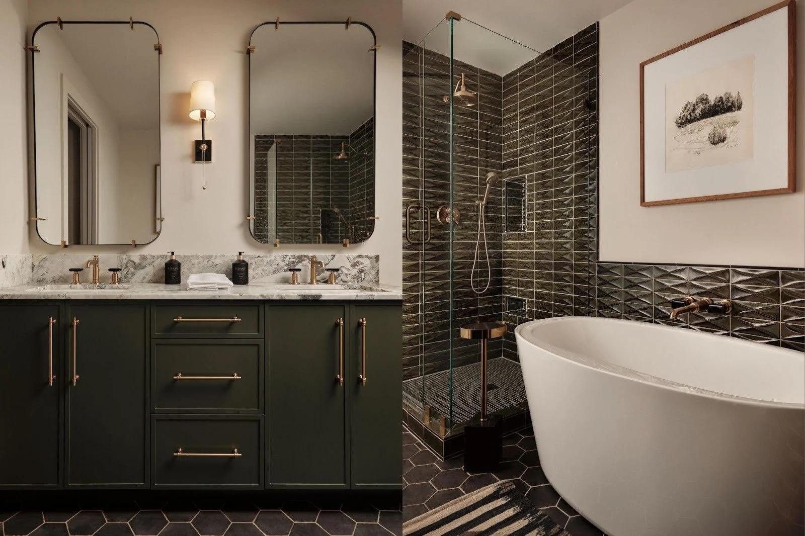 The gorgeous dimensional subway tile adds a quiet texture that plays off the rich green and bronze tones. The result is elevated, timeless, and undeniably serene.